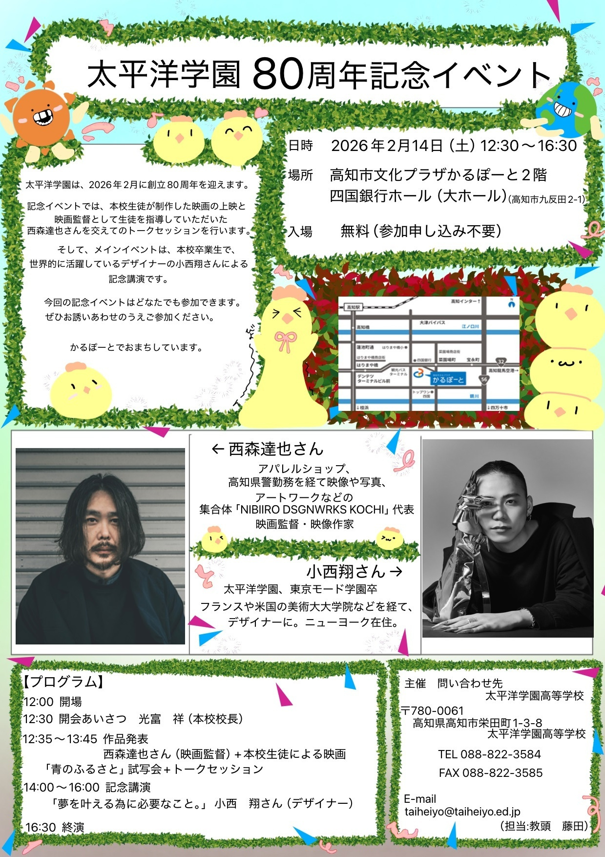 太平洋学園は2025年度に創立80周年を迎えます。それを記念して、2026年2月14日には、高知市文化プラザ・かるぽーとの四国銀行ホール(大ホール)で、「80周年記念イベント」を開催します。
